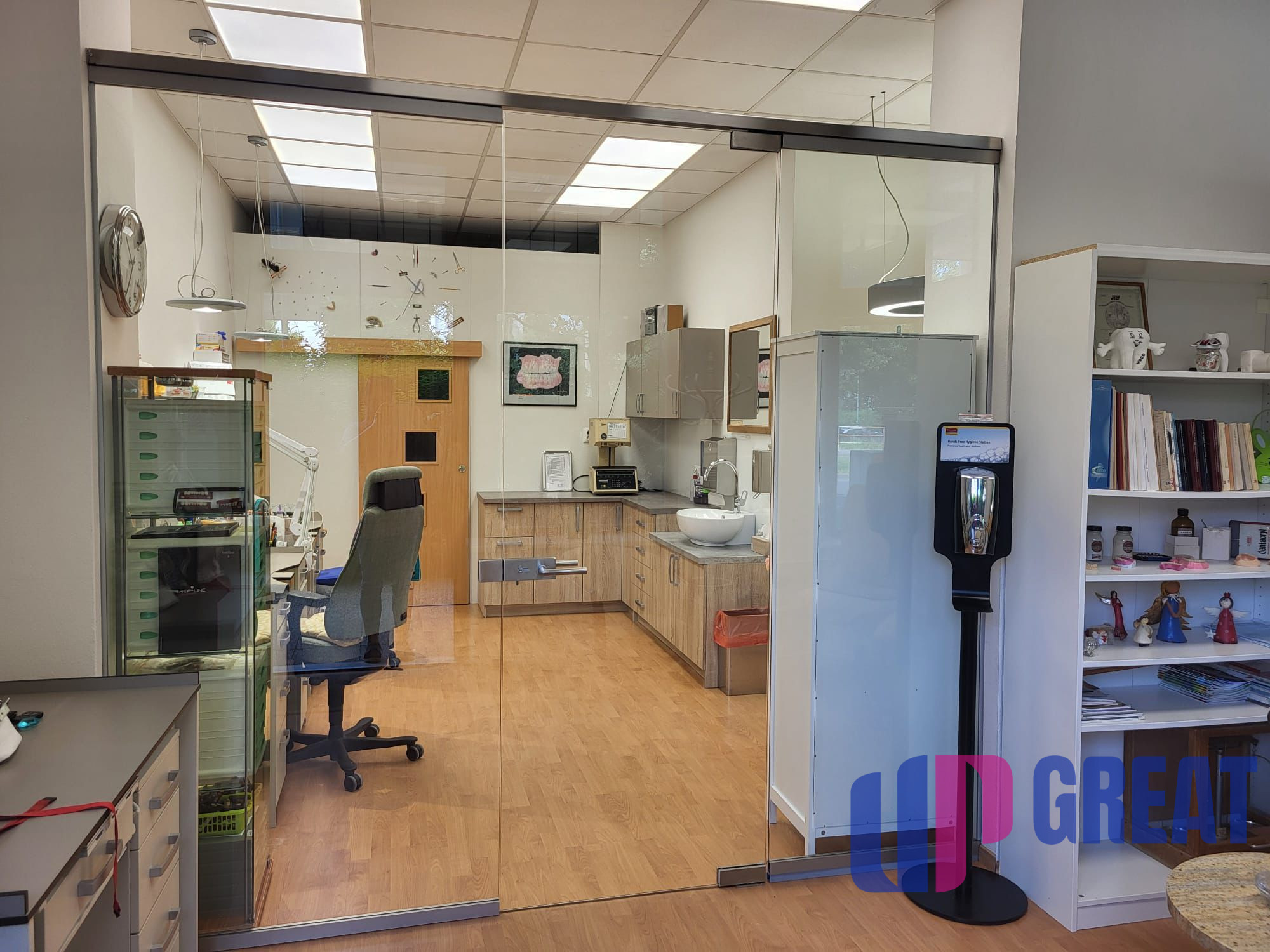 Svetlý interiér, čisté línie, presklené deliace steny a praktické riešenia vytvárajú profesionálnu atmosféru. Exteriér na rušnej ulici zabezpečuje nepretržitú expozíciu značky a jednoduchý prístup pre klientov.
