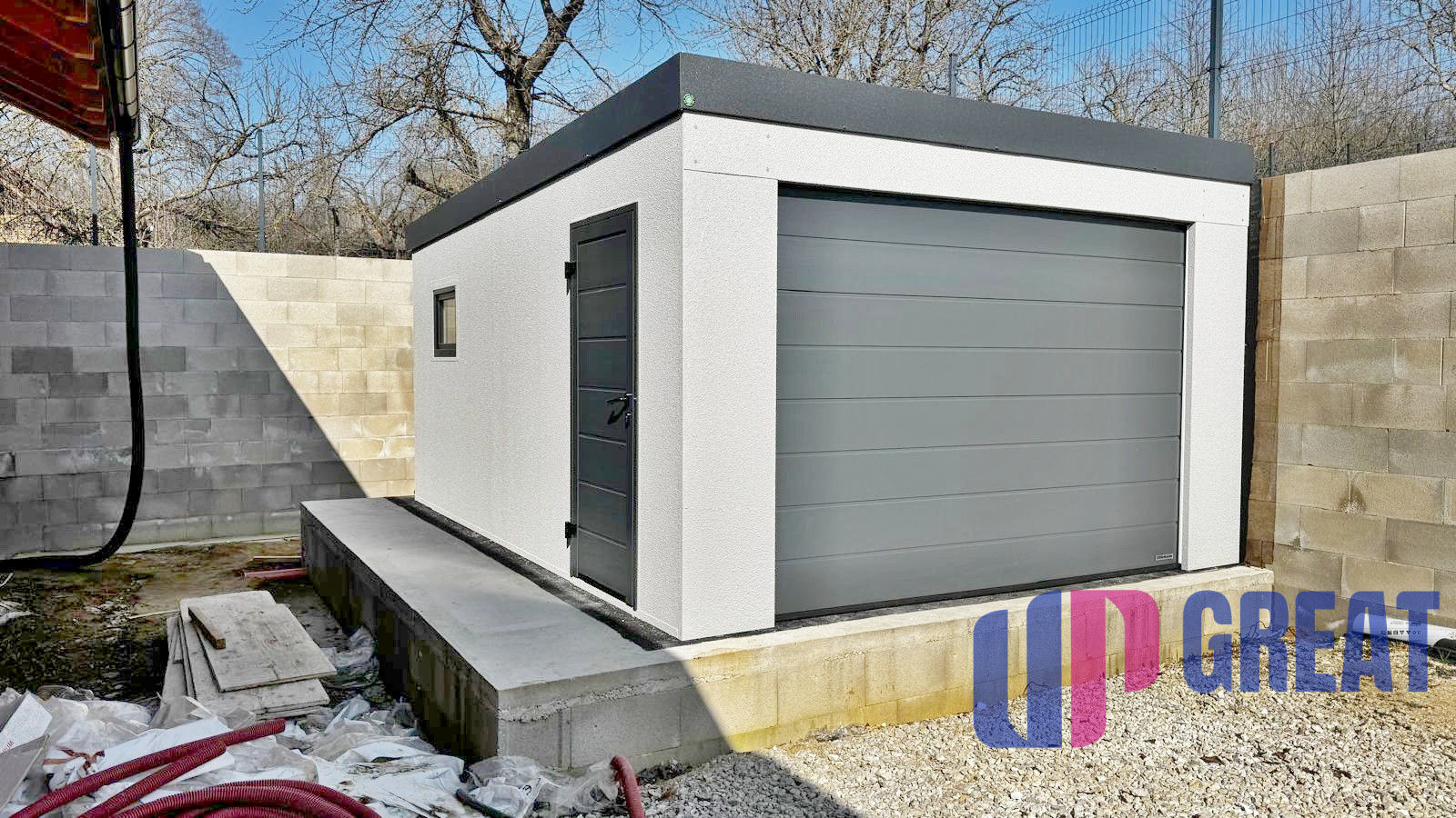 • spevnený oporný múr, základová doska pod garáž (projekt GARDEON – montovaná)