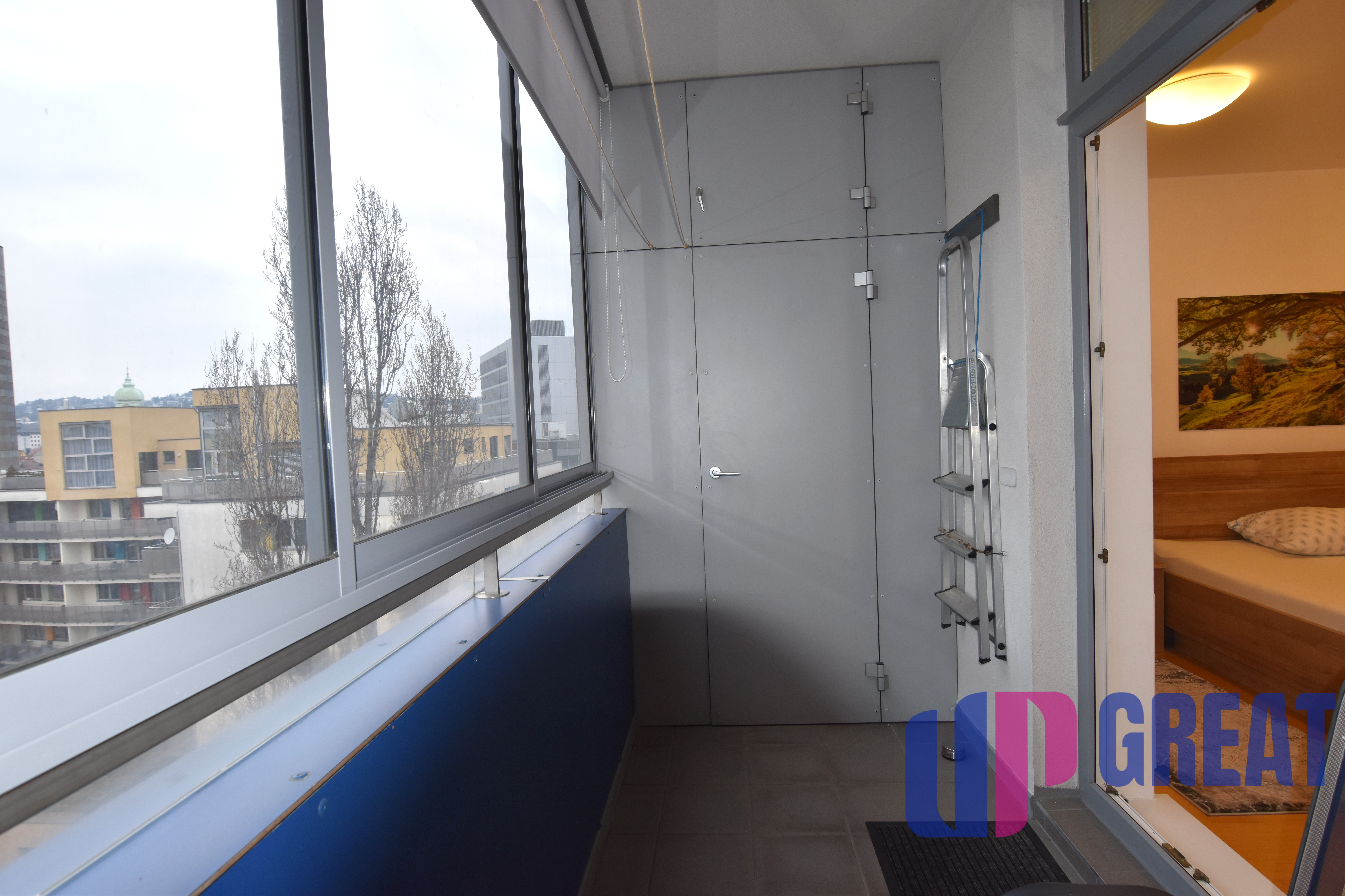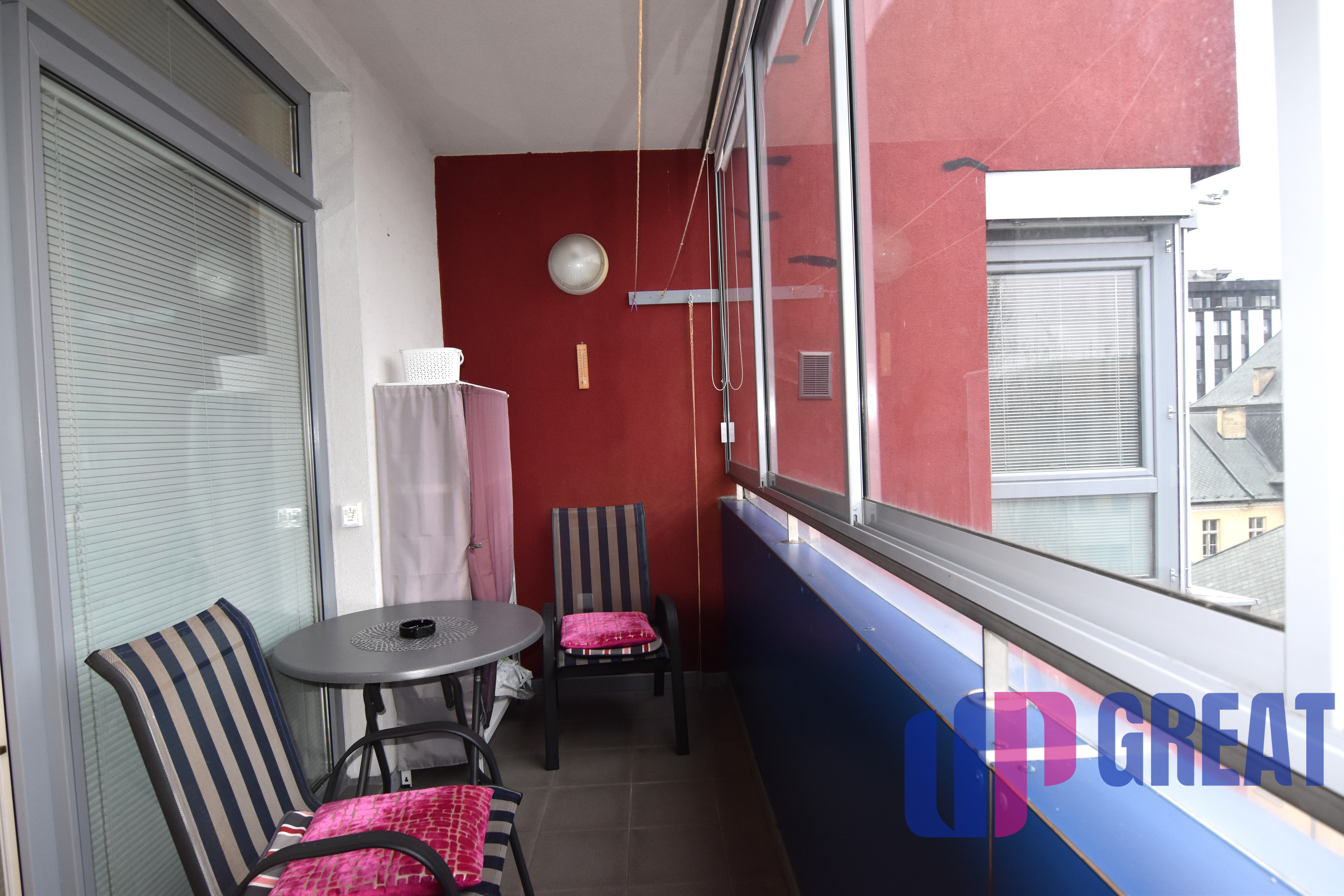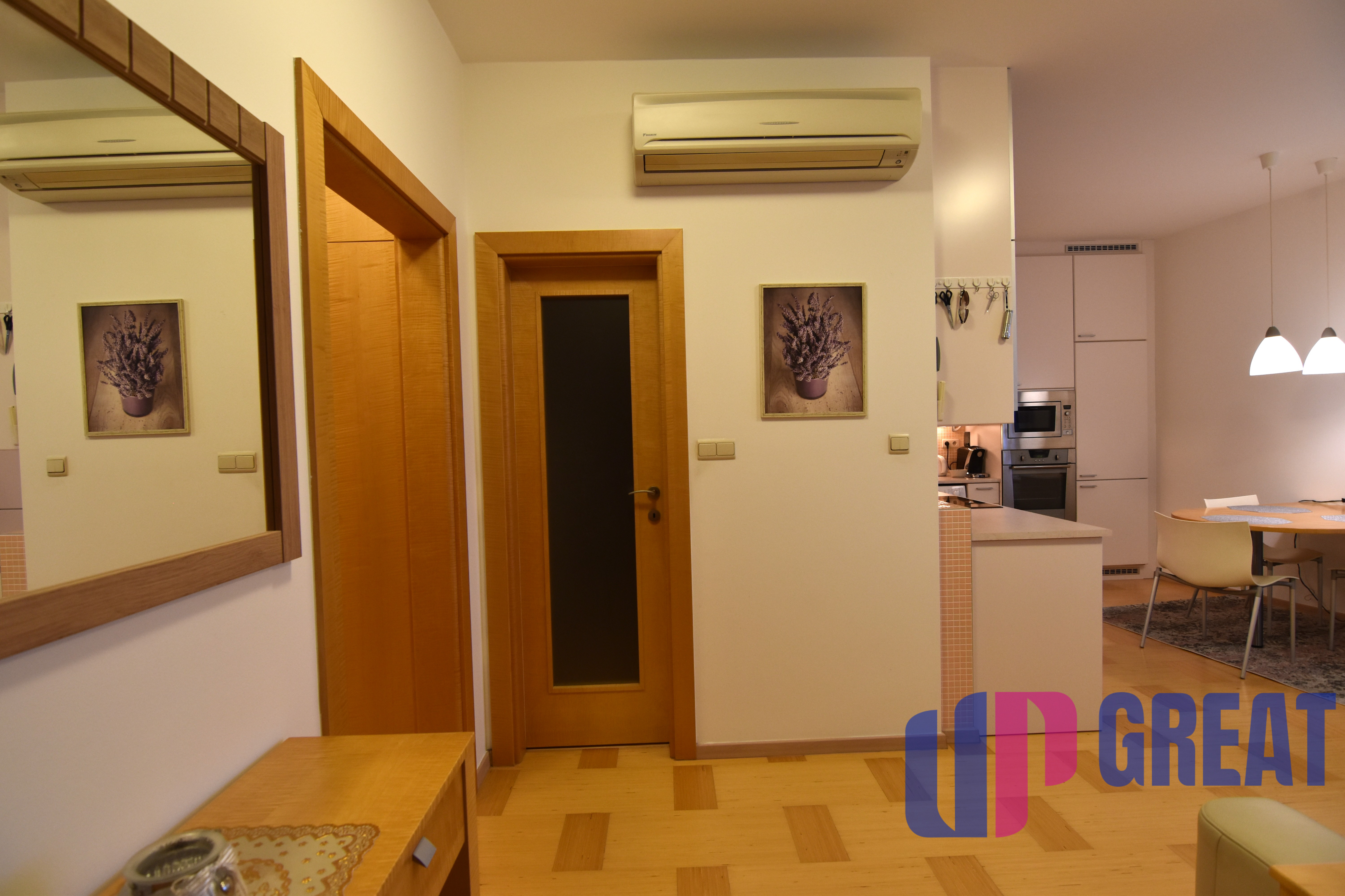 Po vstupe do bytu sa nachádza chodba so vstavanými skriňami, z ktorej je vstup do otvorenej priestrannej samostatnej kuchyne a kúpeľne s WC. Kuchyňa je vybavená novou modernou linkou so všetkými spotrebičmi: umývačka, mikrovlnná rúra, elektrická rúra, elektrický sporák, digestor, kávovar, práčka, pohodlné kreslá, stôl a stoličky. Z kuchyne je vstup do spálne a následne na zasklený balkón. V spálni je veľká manželská posteľ, nočné stolíky, komoda, skrinka, pohovka so stolíkom a veľký TV. Na balkóne je vstavaná skriňa, stolík a stoličky. Všetky okná majú elektrické žalúzie. Kúrenie je regulovateľné, samotný kotol je pred bytom v samostatnej spoločnej miestnosti.