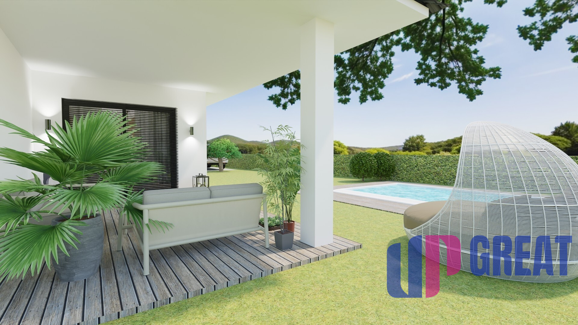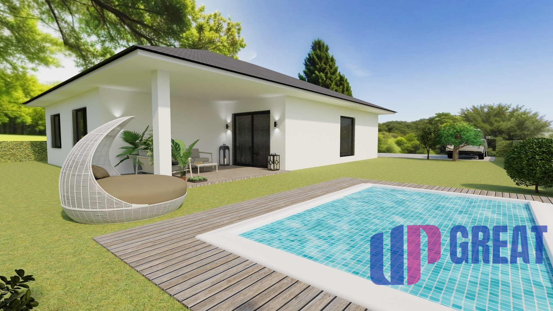 Dominantou pozemku je priestor pre možný budúci bazén umiestnený hneď vedľa terasy, čo vytvára ideálne miesto na relax aj rodinné stretnutia. Zadná časť pozemku ponúka dostatok priestoru a súkromia, pričom bočný pás (cca 8 m šírka) a zadný pás 5m dlžka za domom poskytuje ďalšie možnosti využitia – záhrada, oddychová zóna alebo praktické zázemie.