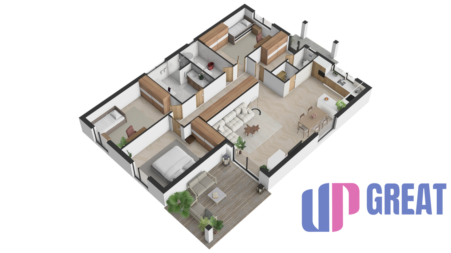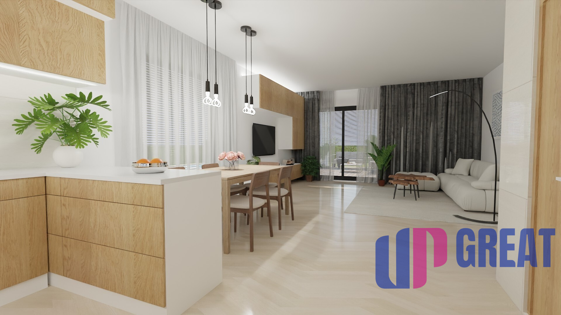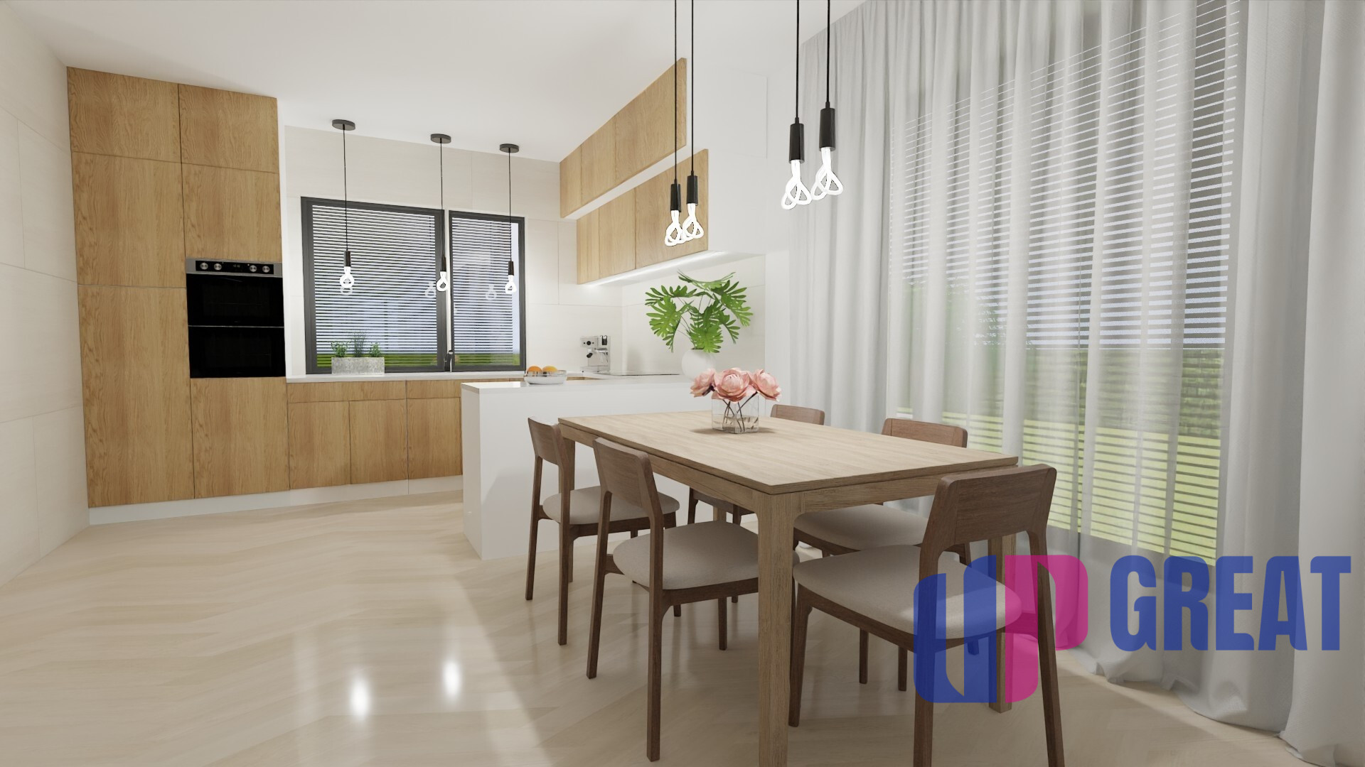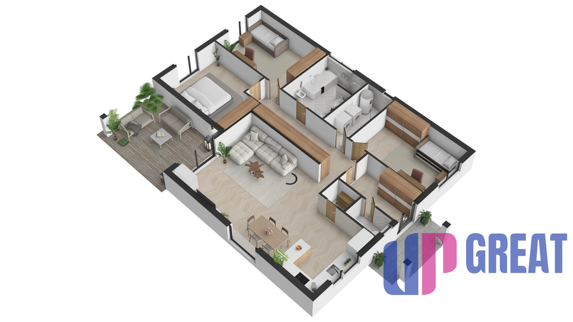 Dom disponuje premyslenou dispozíciou s dôrazom na dennú zónu – priestranná obývacia izba je prepojená s kuchyňou a jedálňou a plynulo nadväzuje na krytú terasu. Veľkoformátové presklenie zabezpečuje dostatok prirodzeného svetla a priame prepojenie interiéru s exteriérom.