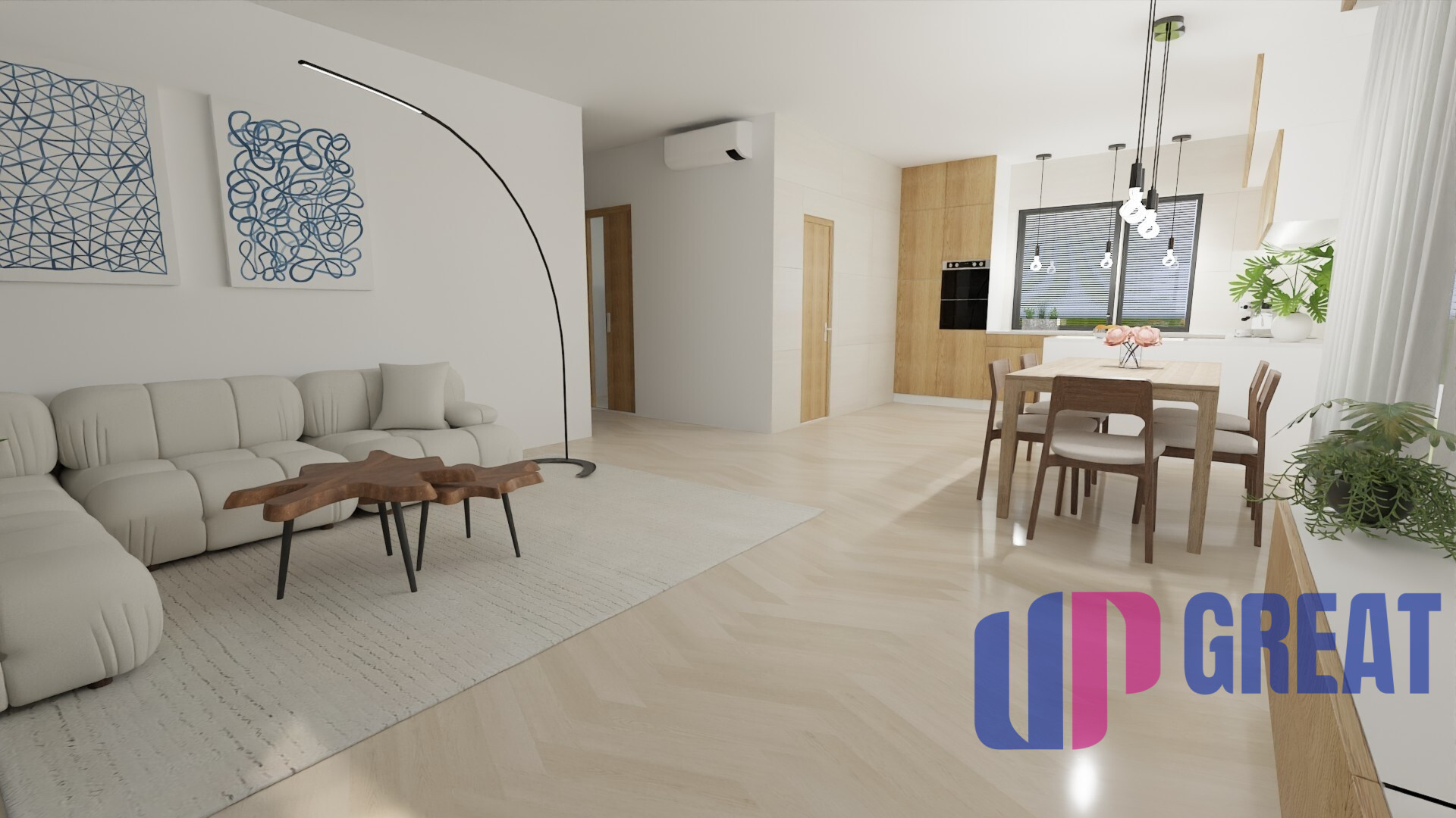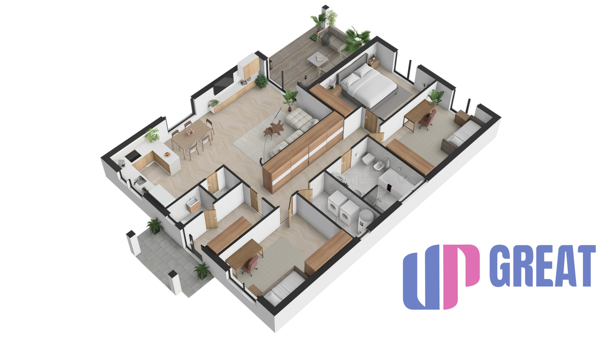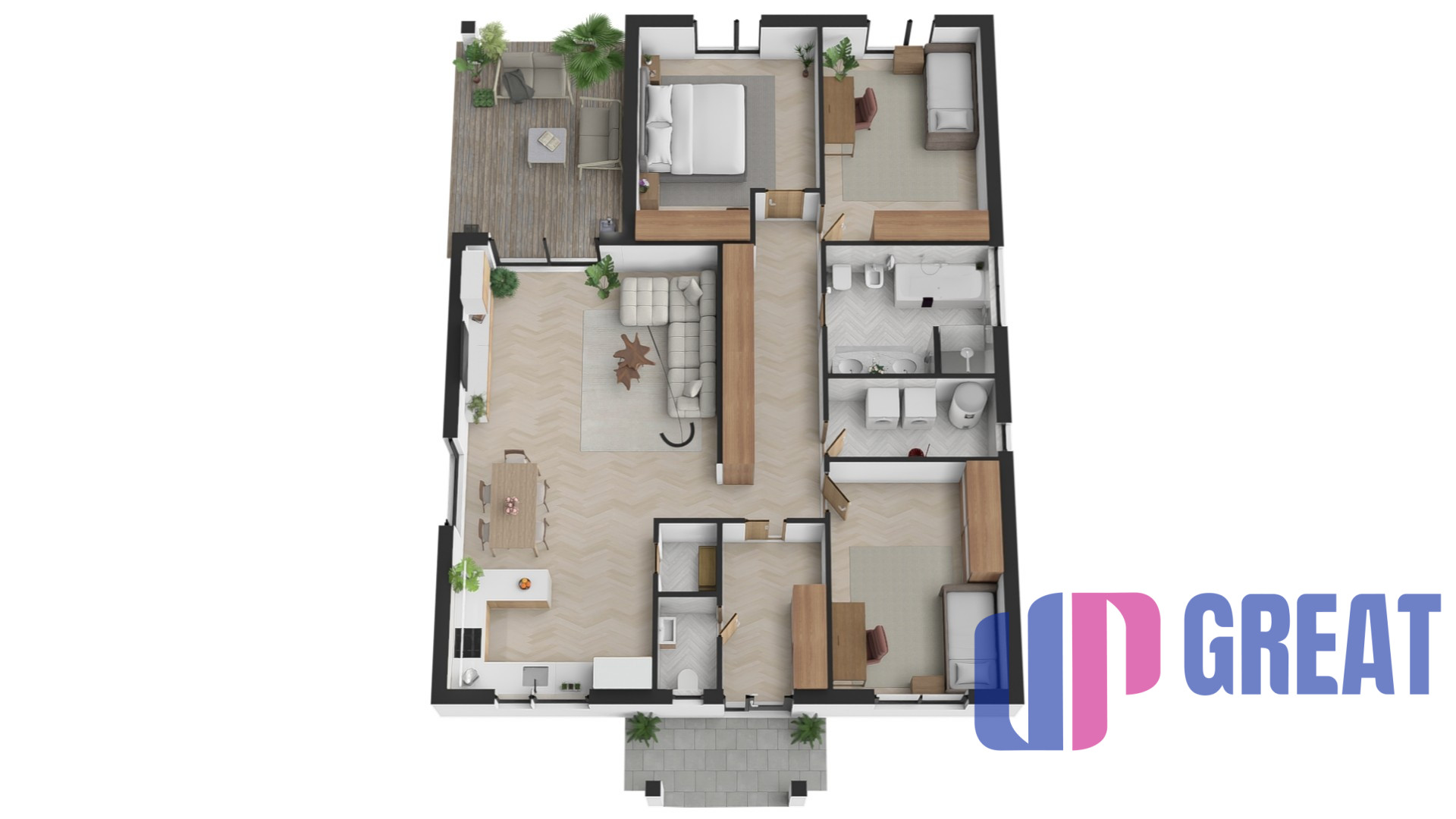 Dom disponuje premyslenou dispozíciou s dôrazom na dennú zónu – priestranná obývacia izba je prepojená s kuchyňou a jedálňou a plynulo nadväzuje na krytú terasu. Veľkoformátové presklenie zabezpečuje dostatok prirodzeného svetla a priame prepojenie interiéru s exteriérom.