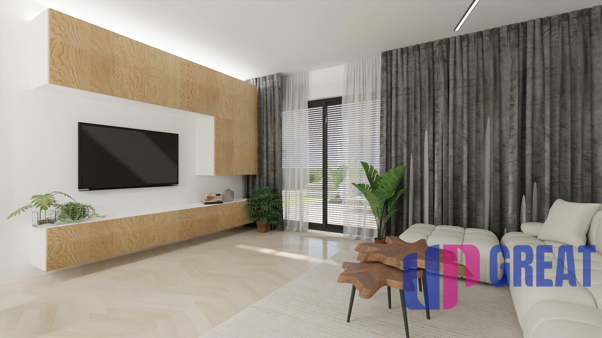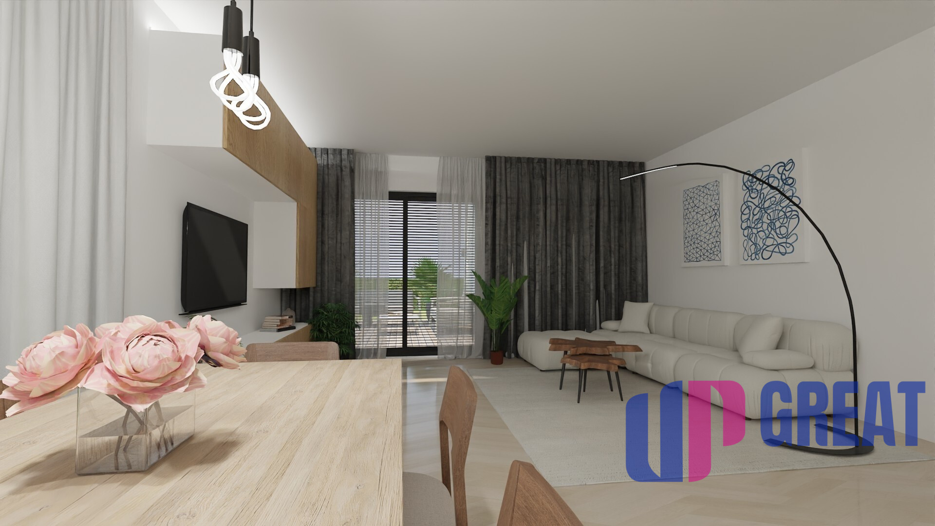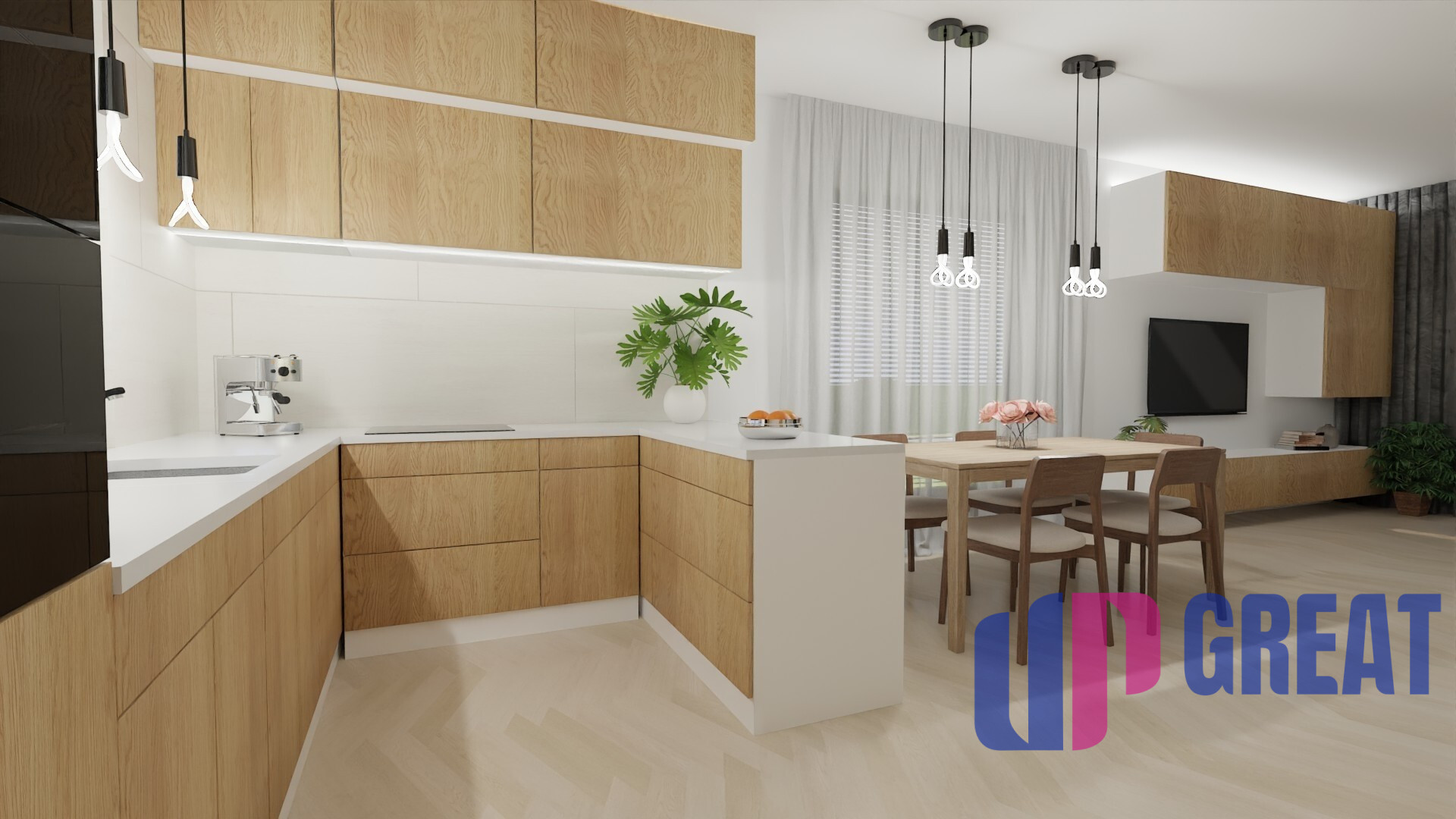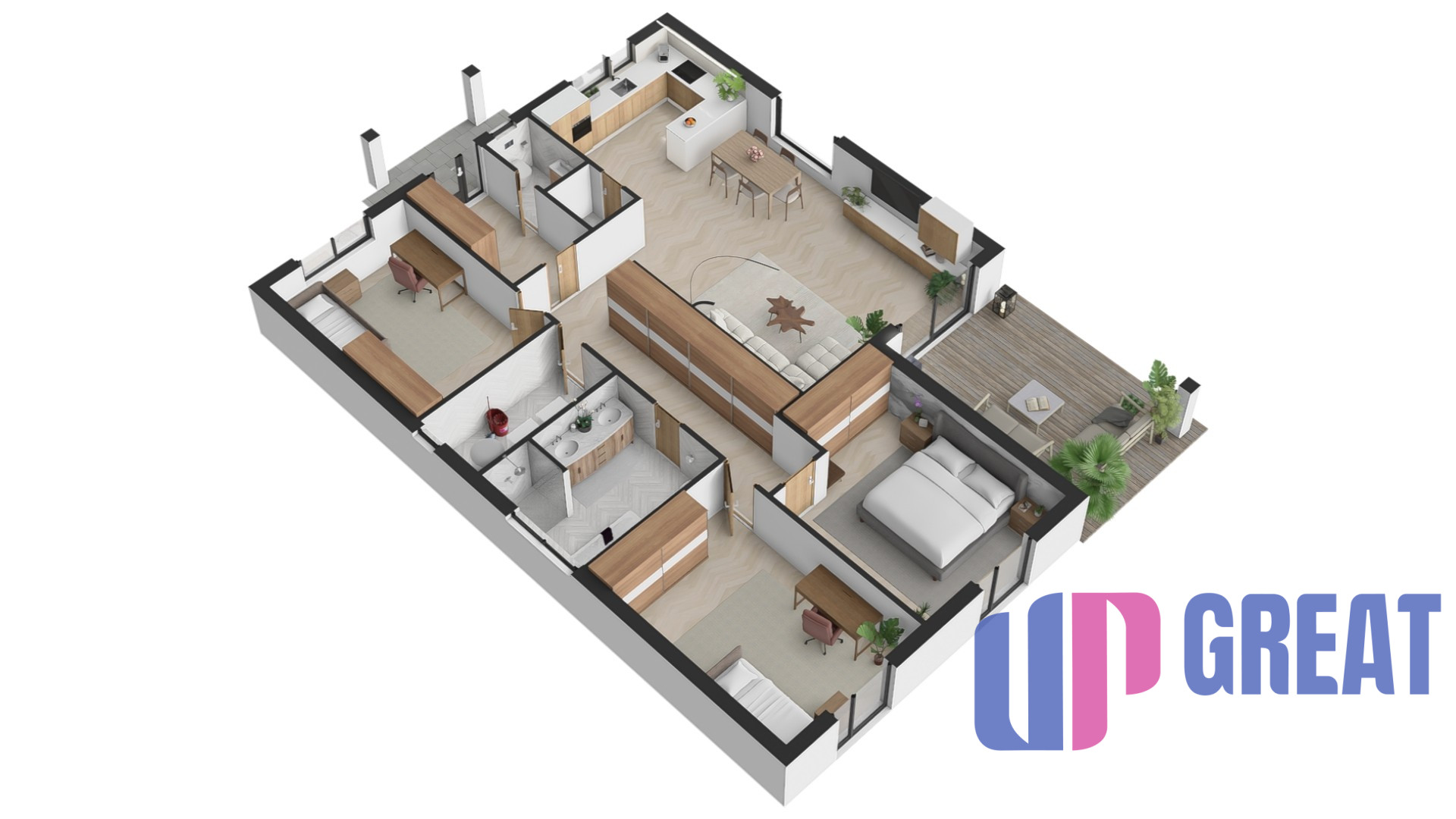 Dom disponuje premyslenou dispozíciou s dôrazom na dennú zónu – priestranná obývacia izba je prepojená s kuchyňou a jedálňou a plynulo nadväzuje na krytú terasu. Veľkoformátové presklenie zabezpečuje dostatok prirodzeného svetla a priame prepojenie interiéru s exteriérom.